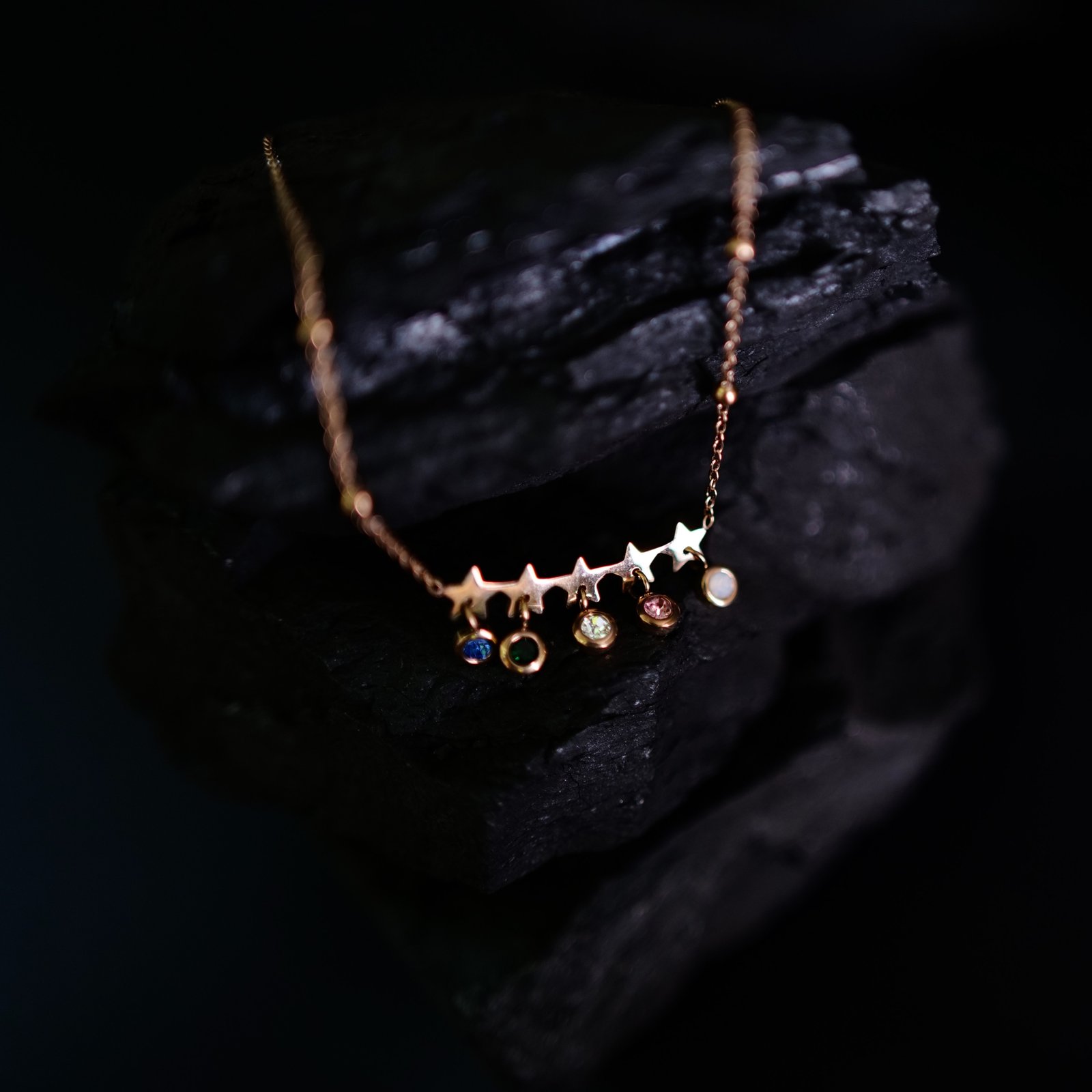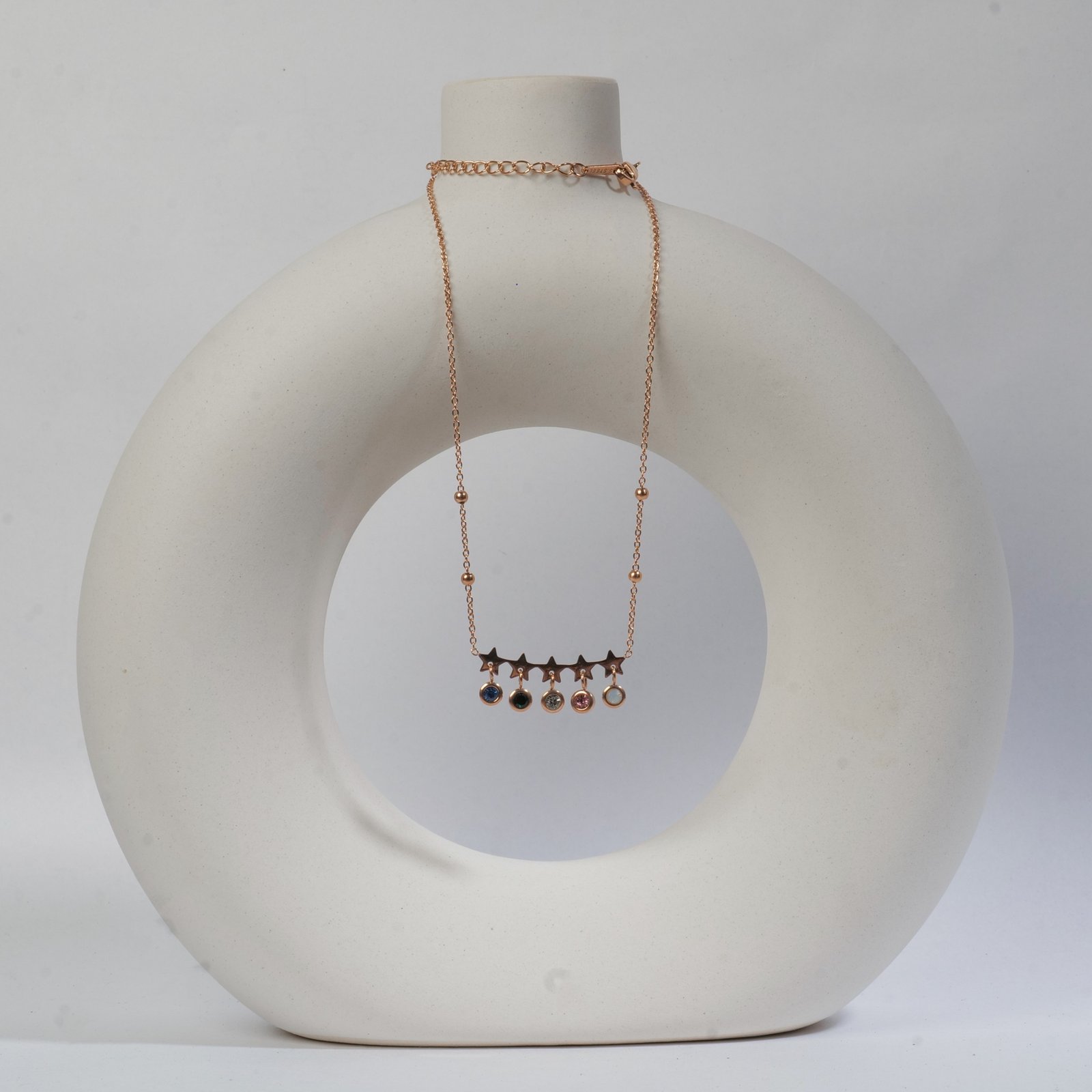 Illuminate your style with this stunning celestial necklace, featuring a trail of shimmering stars and vibrant gemstones. A perfect blend of cosmic charm and modern elegance, this piece adds a playful yet sophisticated touch to any outfit. Let your inner star shine brightly with this unique masterpiece.
