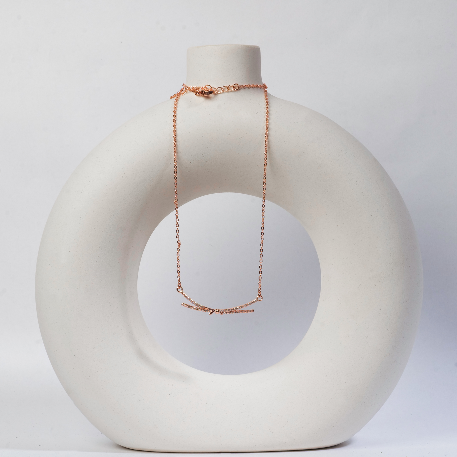 Refined simplicity meets sparkling elegance in this sleek necklace, featuring delicate crossed bars adorned with shimmering crystals. The subtle knot detail adds a touch of sophistication, symbolizing strength and unity. Perfect for any occasion, this versatile piece is your go-to accessory for effortless style and timeless charm.